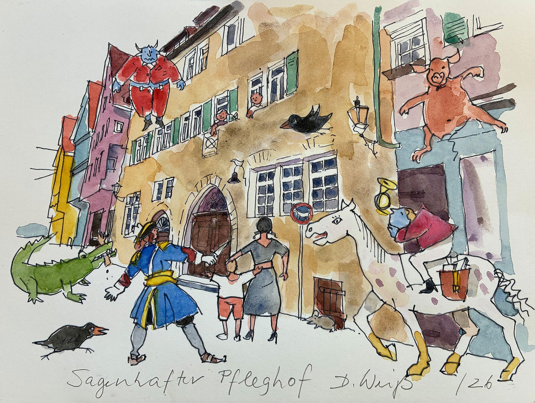 Ich griff zu Stift und Aquarell, um meine Ansicht zum Thema Stadtbücherei auf Papier zu bringen: